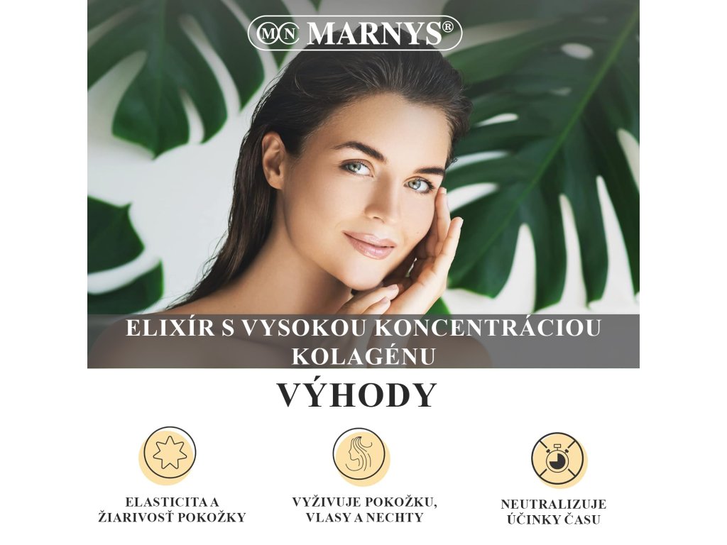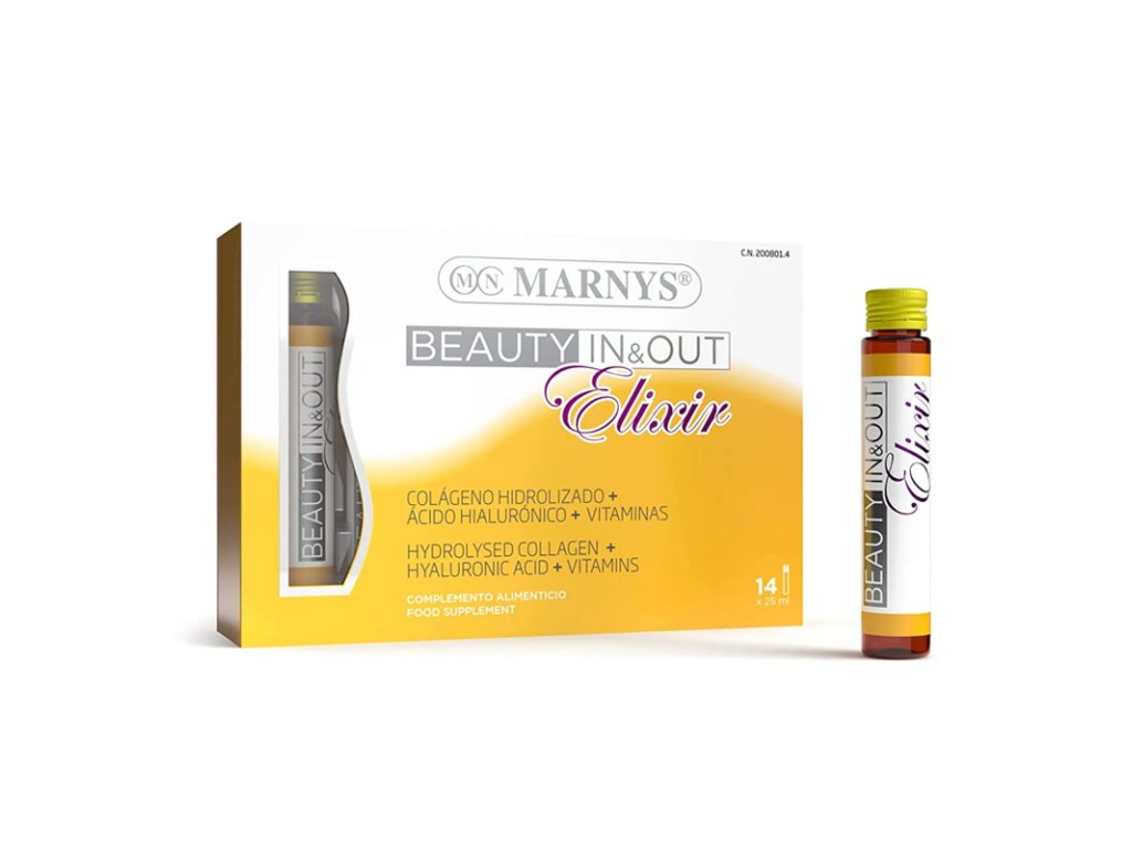 MARNYS Beauty In&Out Elixir obsahuje vysokú koncentráciu hydrolyzovaného hovädzieho kolagénu, kyselinu hyalurónovú, extrakt z hroznových jadierok, vitamíny a minerály. Dostupný v jednorazových ampulkách na pitie.
