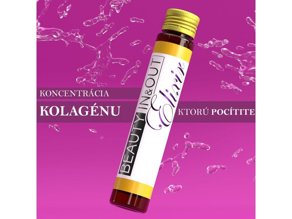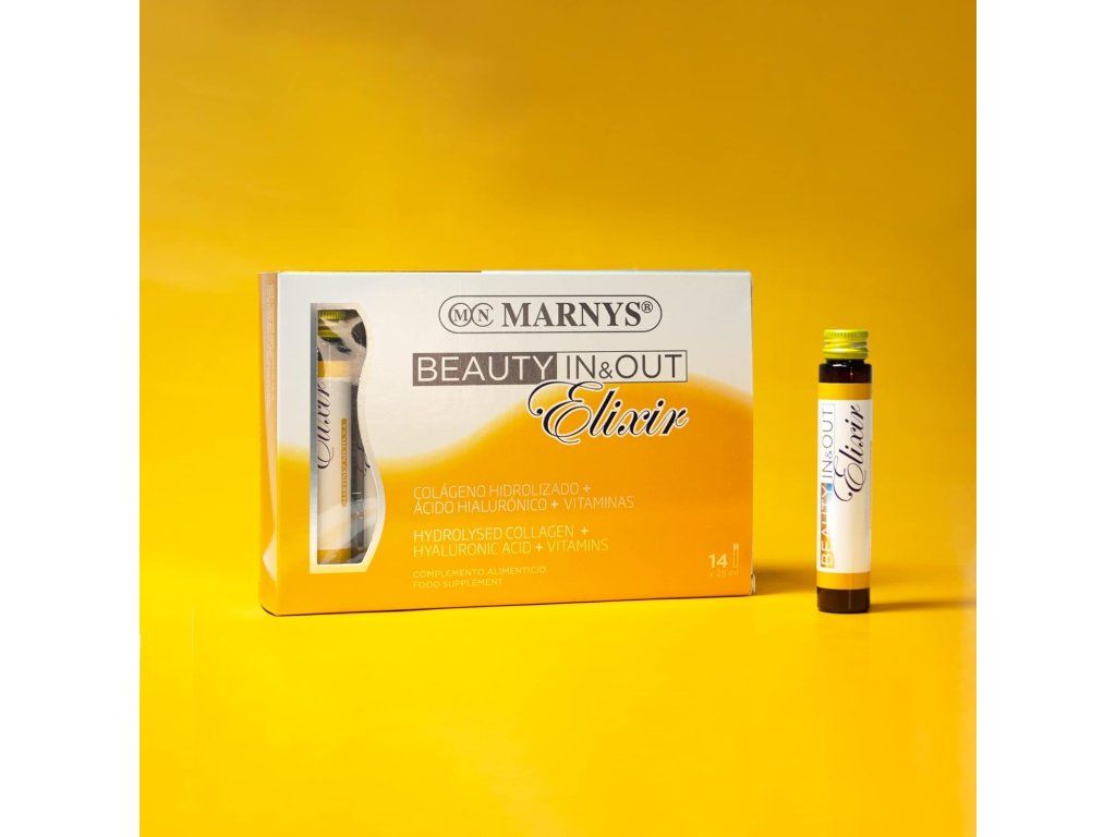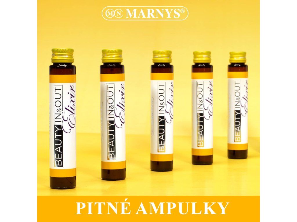 MARNYS Beauty In&Out Elixir obsahuje vysokú koncentráciu hydrolyzovaného hovädzieho kolagénu, kyselinu hyalurónovú, extrakt z hroznových jadierok, vitamíny a minerály. Dostupný v jednorazových ampulkách na pitie.