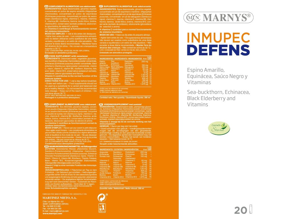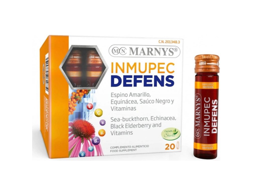 MARNYS® Inmupec Defens je tekutý multivitamín v ampulkách, obsahujúci vitamíny skupiny B, vitamín C, rakytník, echinaceu a bazu čiernu, ktoré podporujú normálnu funkciu imunitného systému a energetický metabolizmus. Vhodný pre vegánov – obsahuje vegánsku formu vitamínu B12.