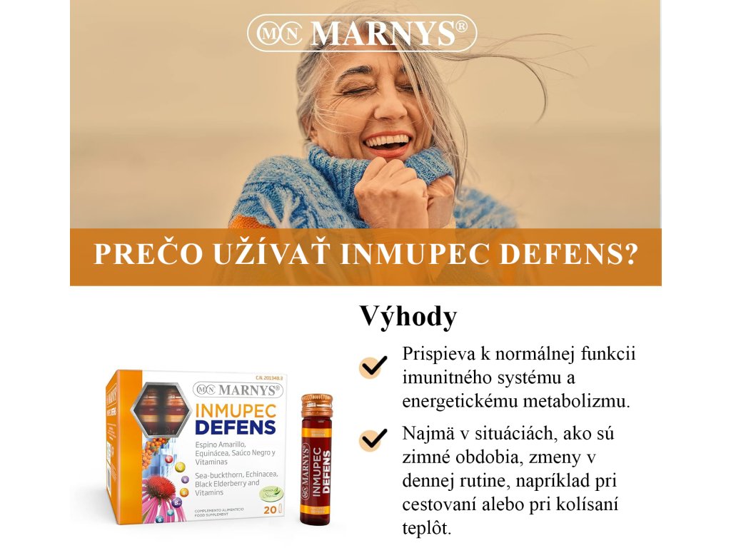 MARNYS® Inmupec Defens je výborný doplnok pre tých, ktorí si chcú udržať silný imunitný systém, najmä v zimných mesiacoch, pri cestovaní, zmenách teploty alebo sezónnych výkyvoch.