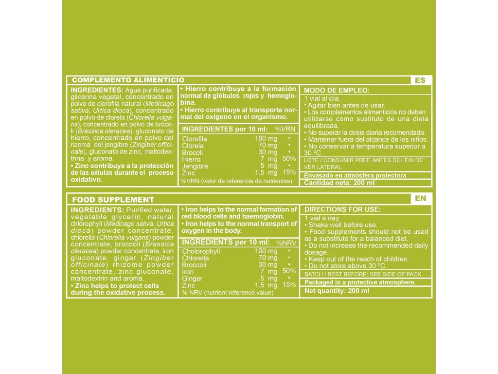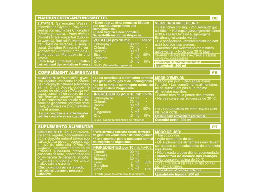 - Chlorofyl v prípravku garantuje minimálny obsah 2–2,4 % a prispieva k tvorbe hemoglobínu ( EFSA ON HOLD 1967).