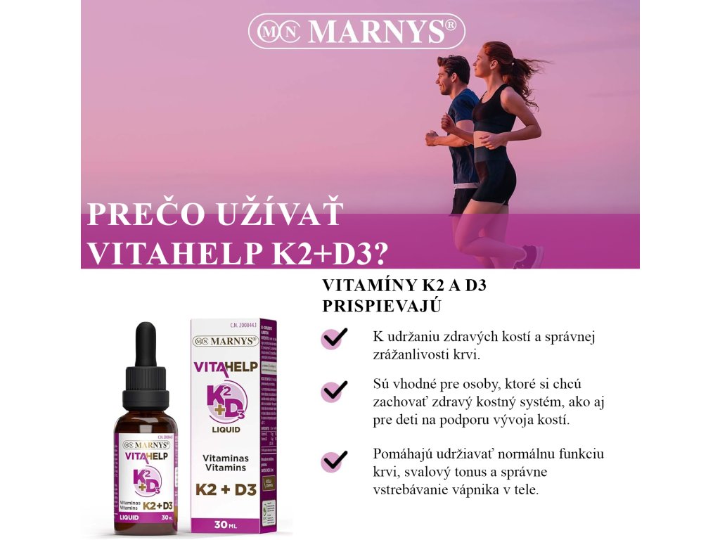 MARNYS K2 a D3 VITAMÍN je tekutý doplnok v olivovom oleji, zabezpečujúci efektívne vstrebávanie a stabilitu aktívnych zložiek (vitamín D3 a K2).